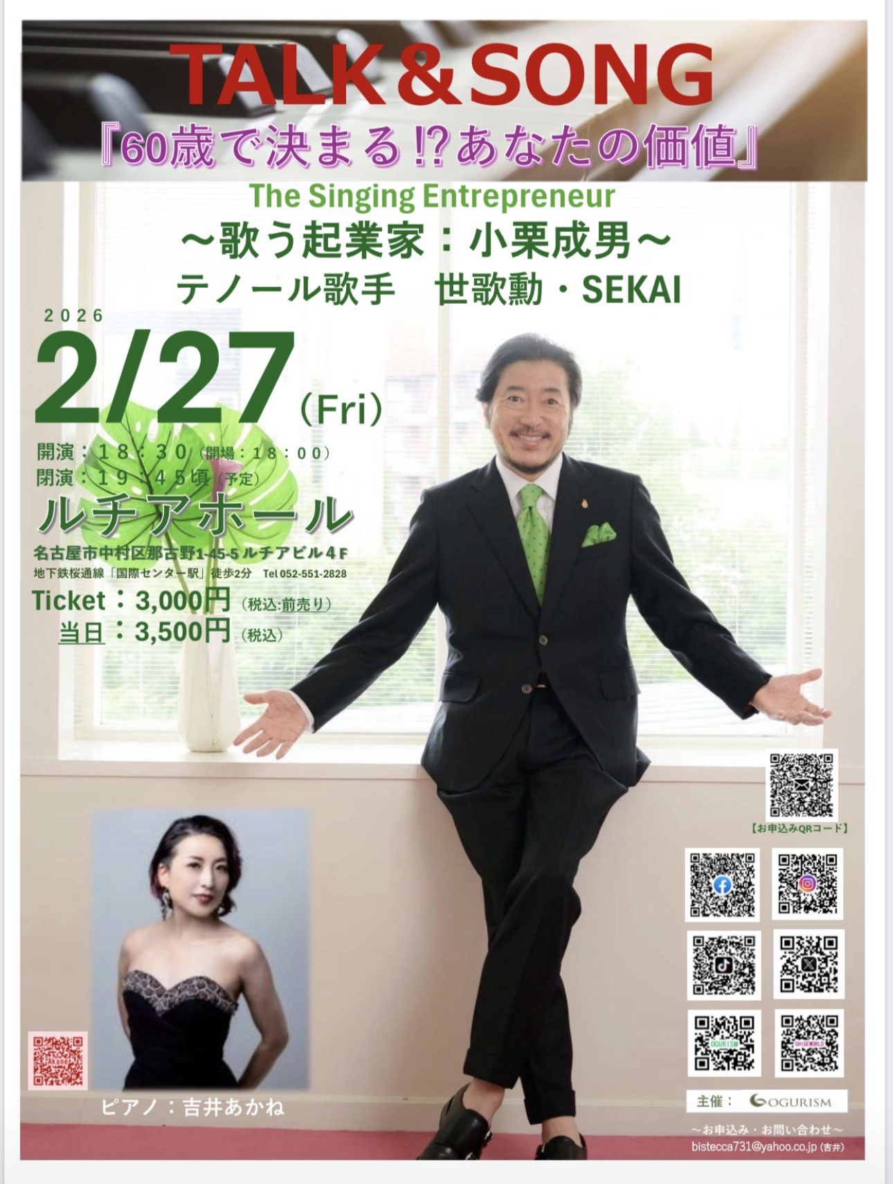 『60歳で決まる⁉️あなたの価値』と題して『歌う起業家 小栗成男&世歌勳・SEKAI』がトーク&ソングのハイブリットな空間をクリエイティブします。
